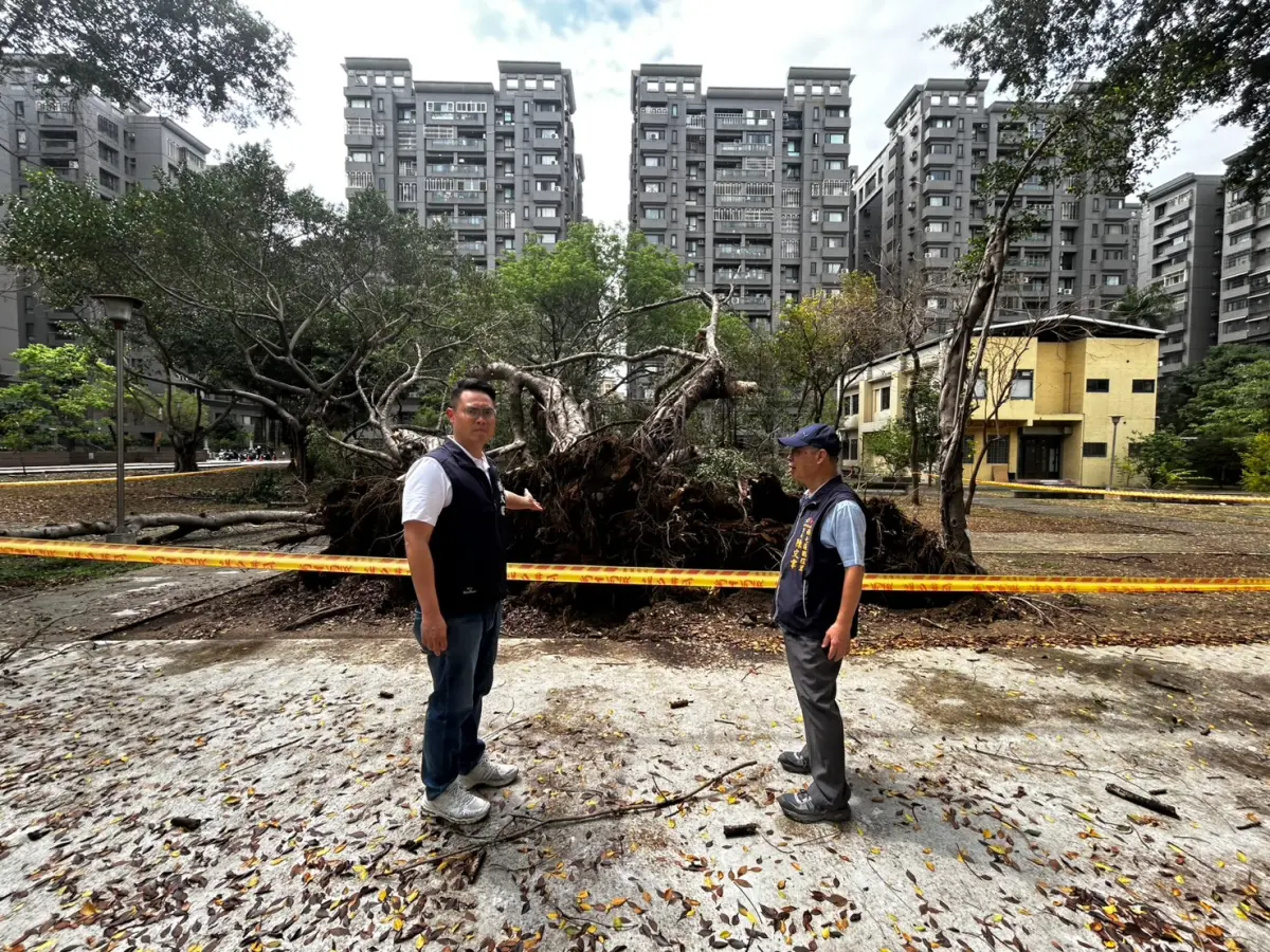 台中西屯文華公園一棵 60 年老榕樹,昨(4) 日晚因強降雨導致地基鬆軟倒下。市議員楊大鋐今現場勘查,雖然現場無人受傷,但龐大樹體仍具危險性。他要求相關單位立即移除...