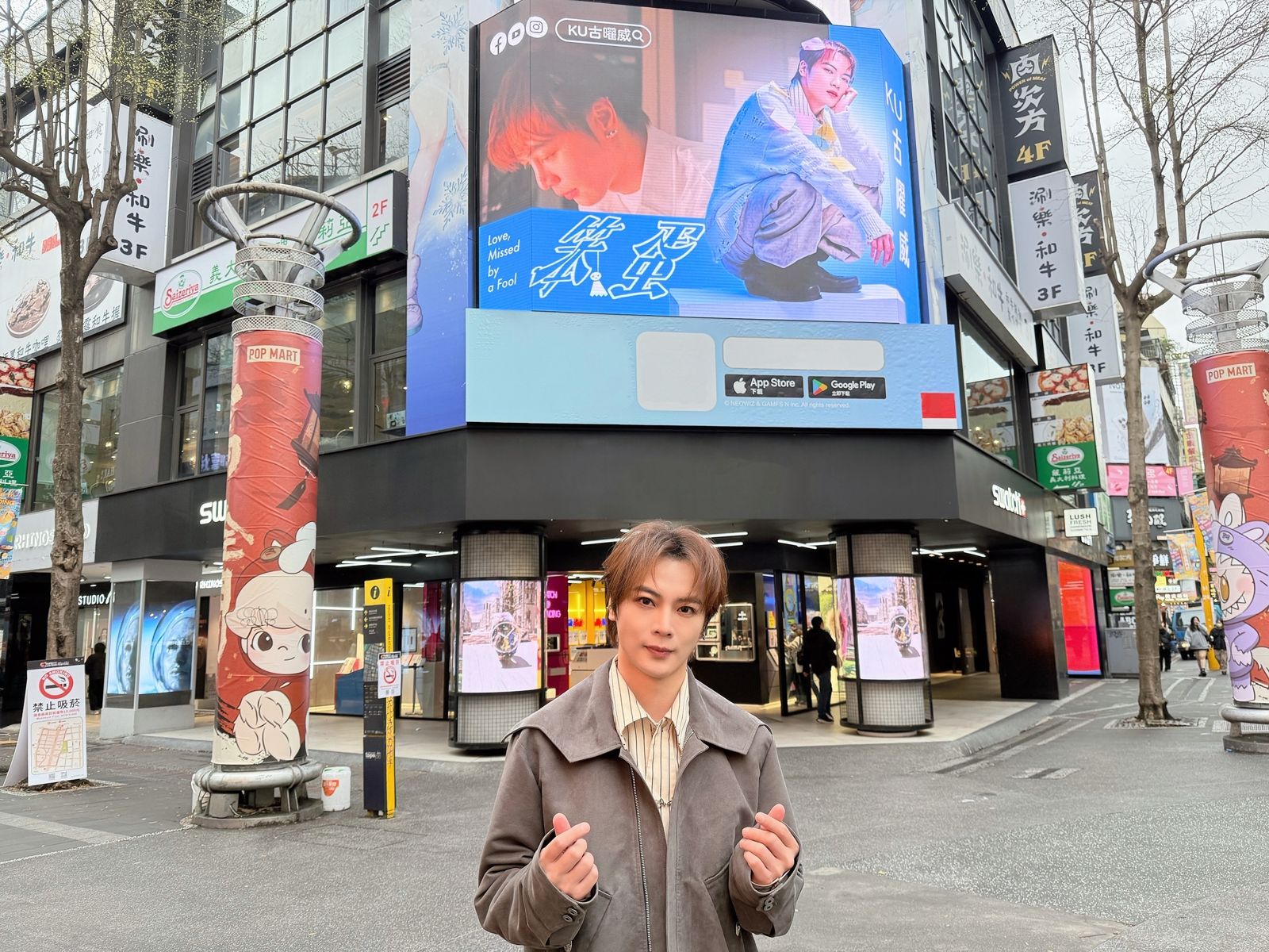 古曜威新單曲〈笨蛋〉發行至今熱度持續攀升,經紀公司豪砸百萬,包下大型電影宣傳車以及西門商圈6號廣場的巨大電視牆,播放MV宣傳影片,並於西門、中山、小巨蛋、東區等地區大肆巡迴宣傳,古曜威一大早特地抽空前往西門商圈,與自己的大型電視牆廣告合照。