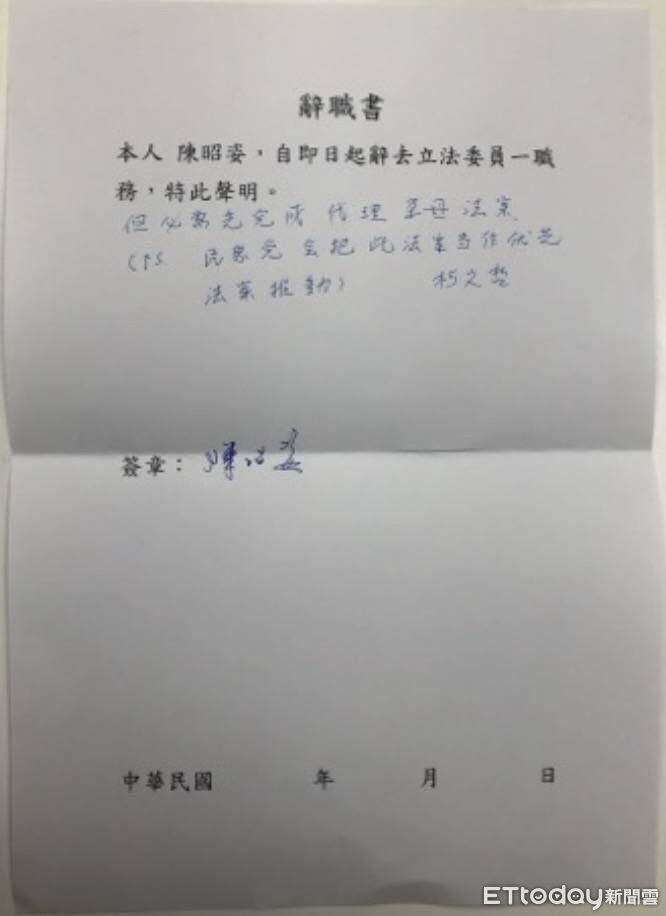 民眾黨近來茶壺風暴延燒,不分區立委2年條款實現將屆,但突傳出陳昭姿是「代孕條款」,待《人工生殖法》修法通過後才會交棒,引發其他將卸任的立委不滿。民眾黨中央委員許瑞宏秀出一張陳昭姿辭職書,其上就寫有但書「必需完成代理孕母法案」、「民中黨會把此法案當作優先法案推動」,還有柯文哲的簽名,代表確實有另外的承諾。