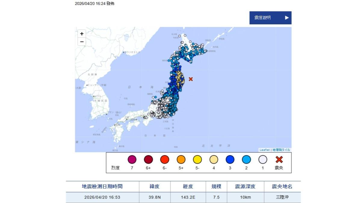 日本東北的三陸外海,20日下午發生規模7.7強震,並立刻觸發海嘯警報。儘管一夜過去,災區迅速恢復平靜,不過這起地震還是造成2人重傷和4人輕傷,而且宮城縣還傳出有道路下陷的零星災情。日本氣象廳更發出「三陸沖餘震注意情報」,提醒未來一週有可能發生規模更大的強震。