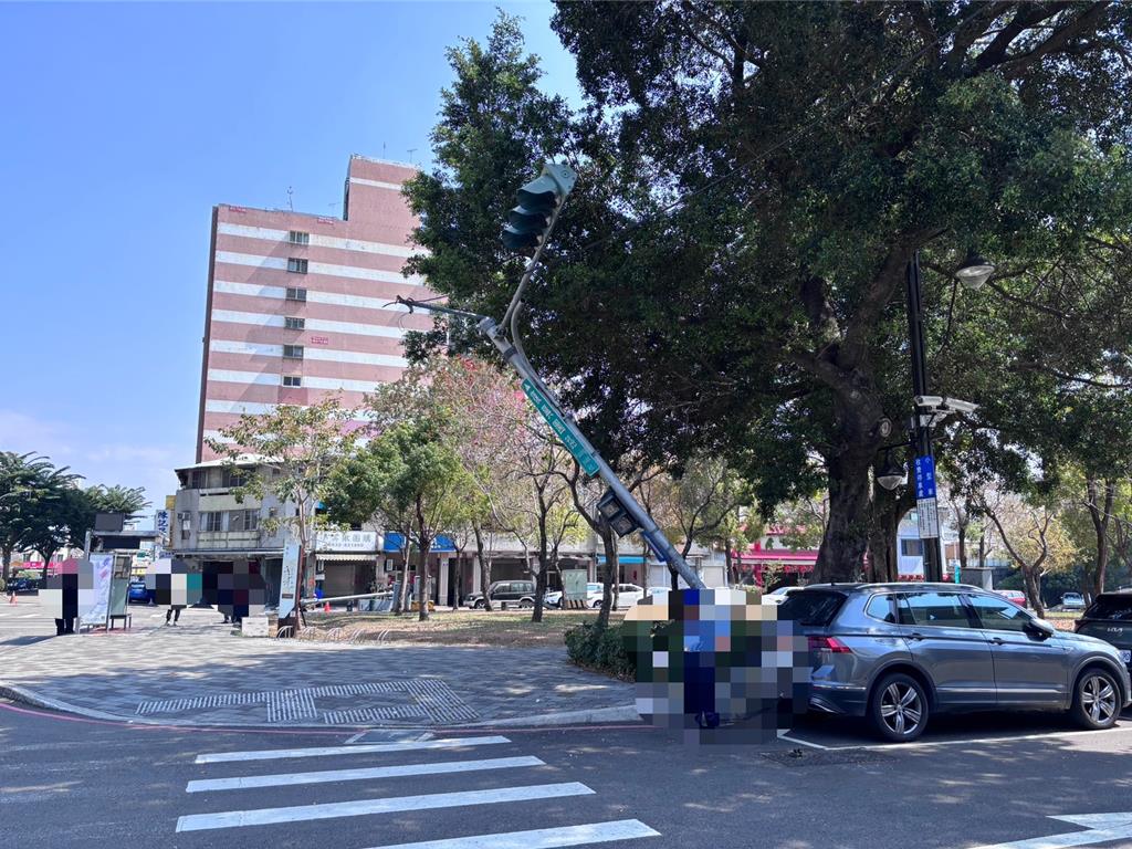 台中市東區23日中午1輛大型吊車行經建成路與復興園路口時,因因吊臂未收勾到上方電纜,強大的拉扯力道導致路口多支號誌桿因不堪負荷,基座當場扭曲變形,其中1根號誌桿更是嚴重歪斜後倒向鄰近人行道,所幸當時無人經