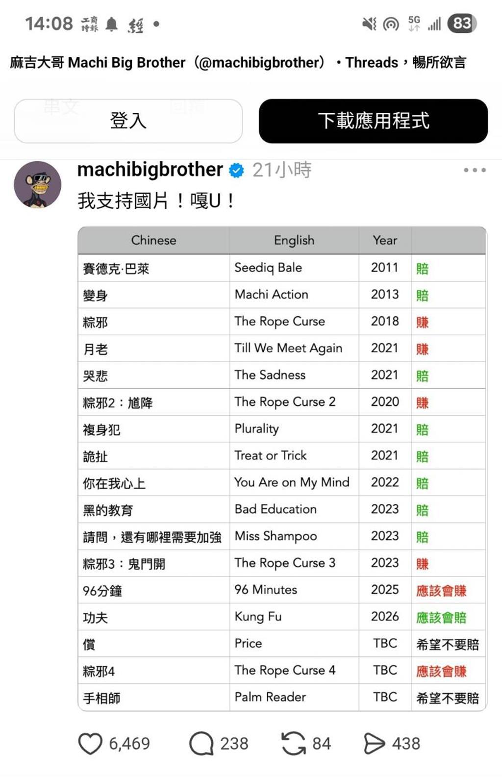 麻吉大哥黃立成22日在社群貼文「國片投資成績單」,已投資17部,其中賺錢4部、應該會賺2部,包括剛下檔的《96分鐘》、即將在8月暑假檔上映的《粽邪4》應該會賺,至於賠錢8部、應該會賠1部,意指仍在線上映的賀歲片《功夫》應該會賠,未上映的《償》、《手相師》希望不要賠,他仍再接再厲高喊:「我支持國片!嘎...
