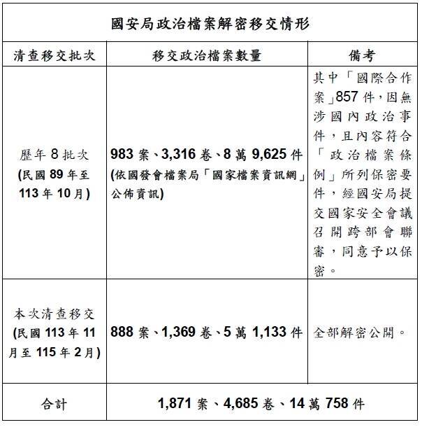 為落實國家轉型正義與政治檔案開放,國安局今(23)日宣布全面解密移交戒嚴時期政治檔案,歷經1年4個月的自主清查後,計有實體檔案近15萬件,併同電子影像檔移交國發會檔案局。國安局自前(2024)年11月起動員全局人力,主動依現行「政治檔案條例」及國發會檔案局「政治檔案審定原則與重點」,分兩階段全面自主清查1992年(民國81年)以前、包含戒嚴時期的全部檔案。首階段清查國安局81年以前所有檔案,總計2萬3757卷,共56萬6415件,並將清查結果及目錄造冊送國發會檔案局審定在案,而於去(2025)年6月審定為政治檔案者計1369卷,5萬1133件;第二階段則針對國發會檔案局審定的5萬1133件政治檔案,採人工方式,採逐卷、逐件、逐頁檢審,並進行檔案解密及掃描作業。
