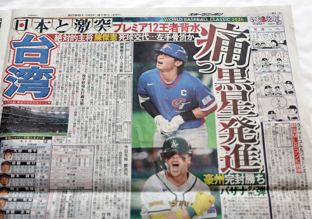 2026世界棒球經典賽中華對澳洲戰,中華隊以0比3輸球,「台灣隊長」陳傑憲還被砸中左手食指骨裂,恐無法再出賽,今天日媒《體育日本》和《報知體育》都大篇幅報導台澳戰的結果,《體育日本》以全版主照片刊出陳傑憲的