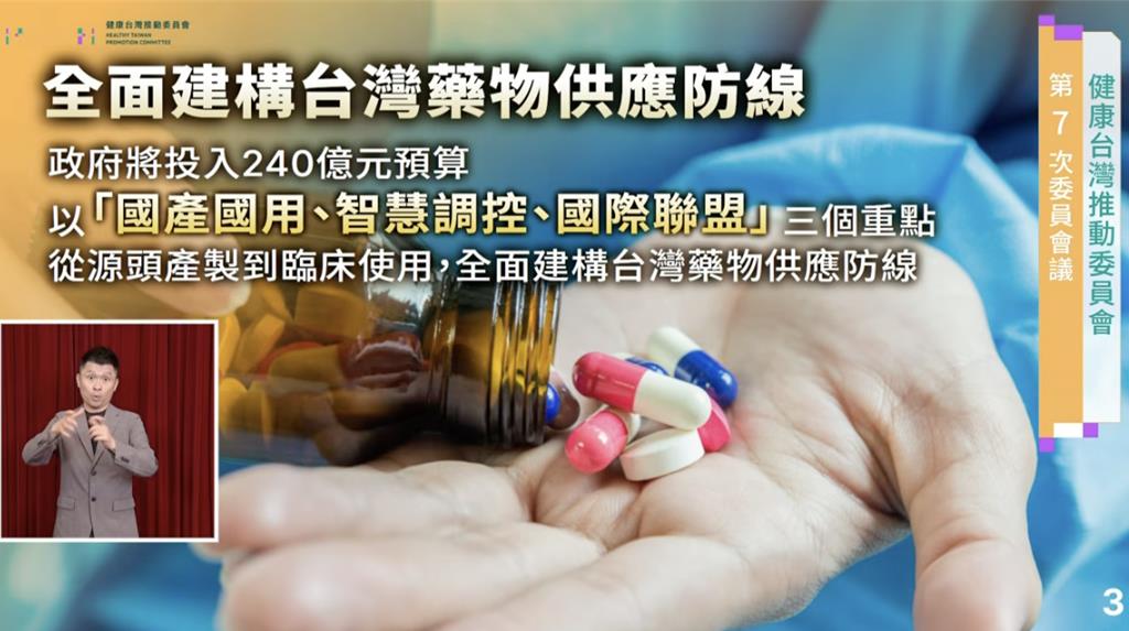 總統府今天舉行第七次健康台灣推動委員會,本次開會主題為藥品韌性,賴清德總統表示,疫後台灣和全球一樣,面臨8成原料藥都仰賴大陸、印度,加上台灣受制境外敵對勢力,藥物穩定供應面臨重大挑戰,政府將投入240億元