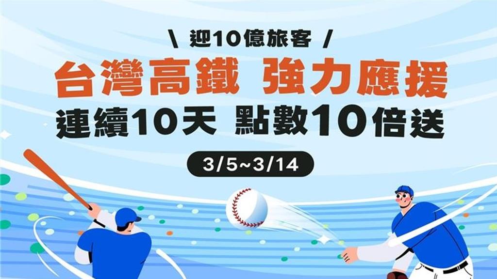世界經典棒球賽(WBC)預賽5日正式開打!台灣高鐵(2633)邀請旅客無畏強敵、更有信心,挺台灣到底,為台灣英雄大聲加油!同時迎接WBC預賽期間,高鐵累計旅運將突破10億人次大關,特別祭出「連續10天 點數10倍送」史上最強優惠,除了回饋旅客對台灣高鐵的支持與愛護外,更邀請大家一起熱血集結,為台灣英...