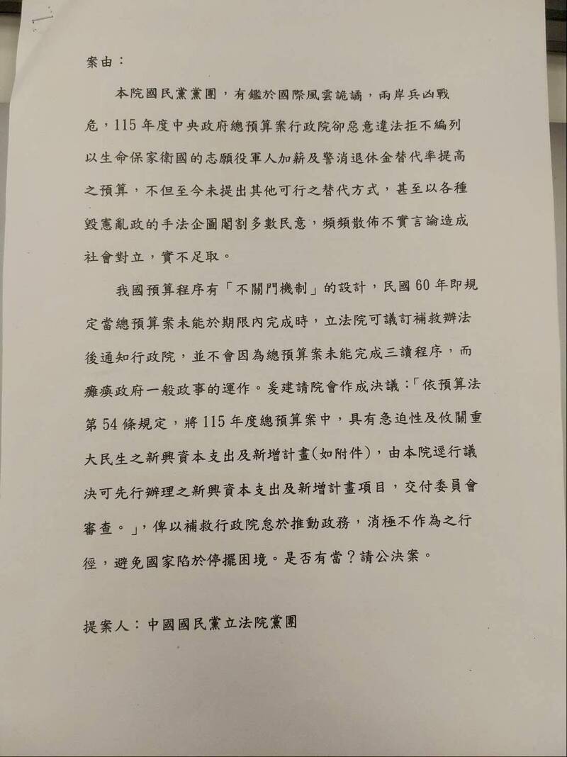 由於115年總預算至今尚未審查,國民黨團原擬在院會提案讓部份新興性計畫先行付委審查。據了解,由於消息提前曝光,加上還有新興計畫細項要再與縣市長溝通,才能確定提案項目,因此今天未在院會提案,將擇期再提出。國民黨團未放行總預算案,但要為執政縣市和民生議題解套,因此在與黨內、民眾黨團溝通後,決定先處理部份新興計畫。而該作法主要依據「預算法」規定,即便總預算未審畢,新興計畫及延續性新增預算只要經立院同意即可動支。