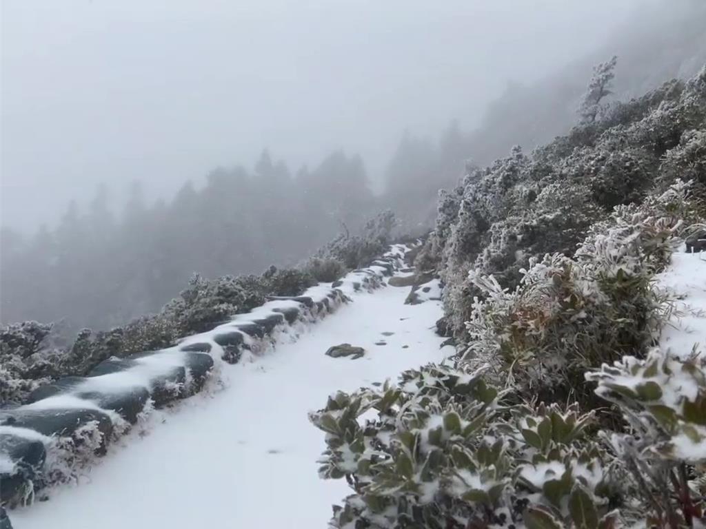 嘉明湖國家步道今(9)日清晨在山屋及步道一帶陸續降雪與冰霰,山屋周邊鋪上一層薄白霜雪。林業保育署台東分署表示,嘉明湖國家步道目前已提升為第6級雪季登山風險等級,提醒登山民眾務必提高警覺,審慎評估行程。台
