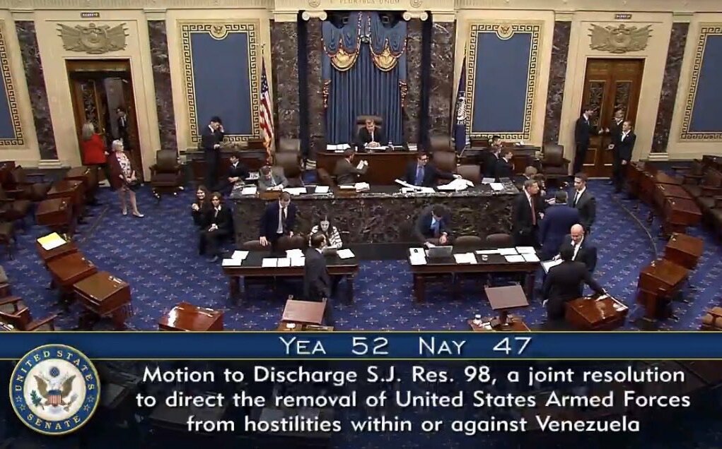 據美國「國會山莊報」(The Hill)、《法新社》報導,美國聯邦參議院於今(9)日以 52 票贊成、47 票反對的結果,表決通過一項涉及《戰爭權力法》(War Powers Act)的決議案,目的在限制總統川普(Donald Trump)在未經國會明確授權的情況下,對委內瑞拉採取進一步的軍事敵對行