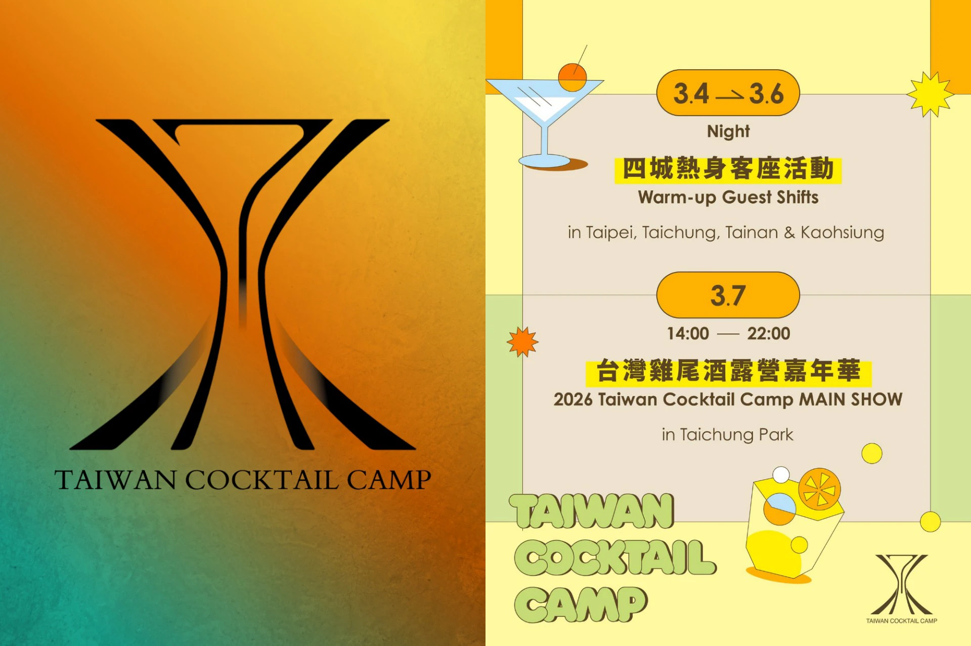 2026 年 3 月 4 日至 7 日,台灣將迎來一場橫跨台北、台中、台南與高雄四大城市的國際級調酒與餐飲盛會 —「Taiwan Cocktai...