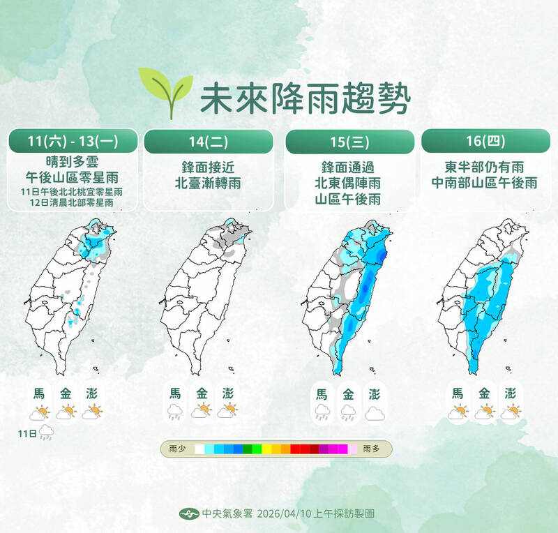 中央氣象署發布強風特報,西南風偏強,今天上午至明晨蘭嶼、新北市、桃園市、新竹市、新竹縣、苗栗縣、屏東縣、連江縣局部地區有平均風6級以上或陣風8級以上發生的機率(黃色燈號)。