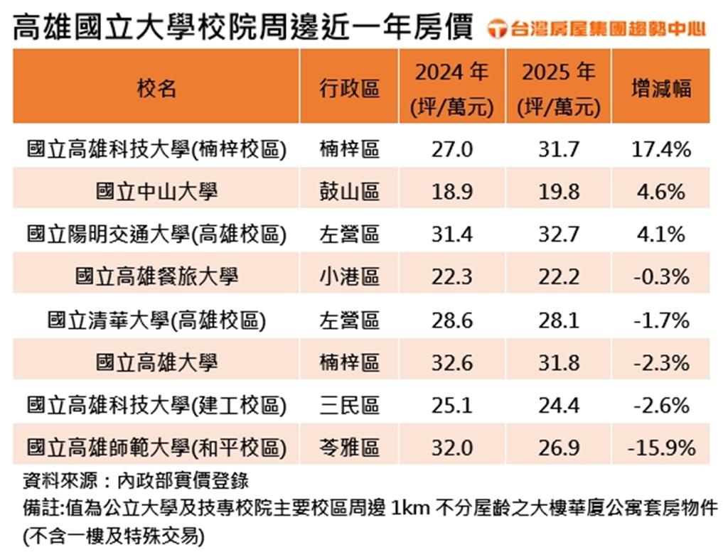 陽明交通大學、以及清華大學先後在高雄設校,使得高雄國立大學與科技大學躍升至8所,不過,各大學生活圈房價表現卻是兩樣情,高科大楠梓校區因距離台積電廠區及楠梓科技產業園區最近,加上有週遭有捷運站,房價一年平均上漲17.4%掄元,而位處市區的高師大和平校區生活圈,因區域開發趨於飽和,缺乏高價新屋產品帶動,...
