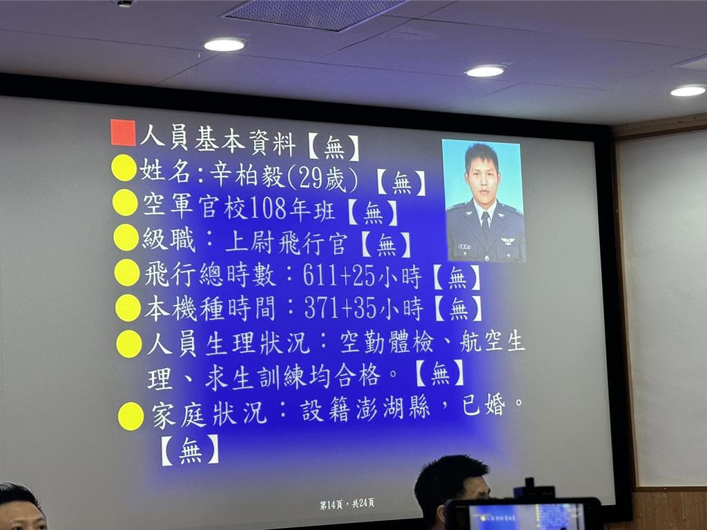 F-16墜落外海,國防部召開記者會說明。國民黨立委馬文君痛批,國防部揭露了空軍飛官辛柏毅上尉出事背後的多項裝備問題,辛柏毅上尉當時駕駛的F-16V戰機,任務電腦故障,未具備自動防撞地系統,甚至連基本的防寒飛行