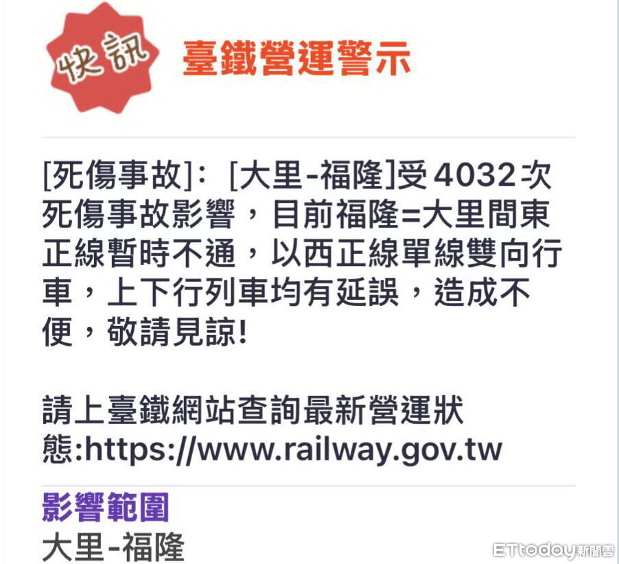 台鐵4032次區間快列車發生死傷事故,今(14)日下午4時05分許,一名64歲男子,不明闖入台鐵石城火車站南下東正線軌道,4032次區間快列車司機員發現時避讓不及直接撞上,男子當場不幸身亡,事故發生,福隆=大里間東正線一度停止通行,並改以西正線單線雙向行車,列車出現延誤。後於下午6時23分許恢復正常通行。鐵路警察調查釐清民眾入侵軌道原因中。