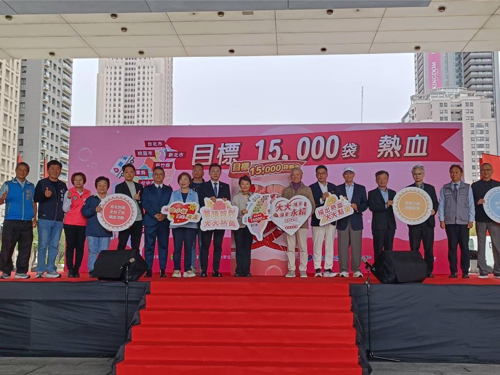 冬天加上高齡化、少子化,捐血的人變少,用血的人變多,大大數位基金會發起「大大攜手 讓愛永續」7縣市捐血巡迴活動,4日在市府廣場前舉行。市長盧秀燕上台表示,大大今年目標1.5萬袋,希望達標。立法院副院長江啟臣