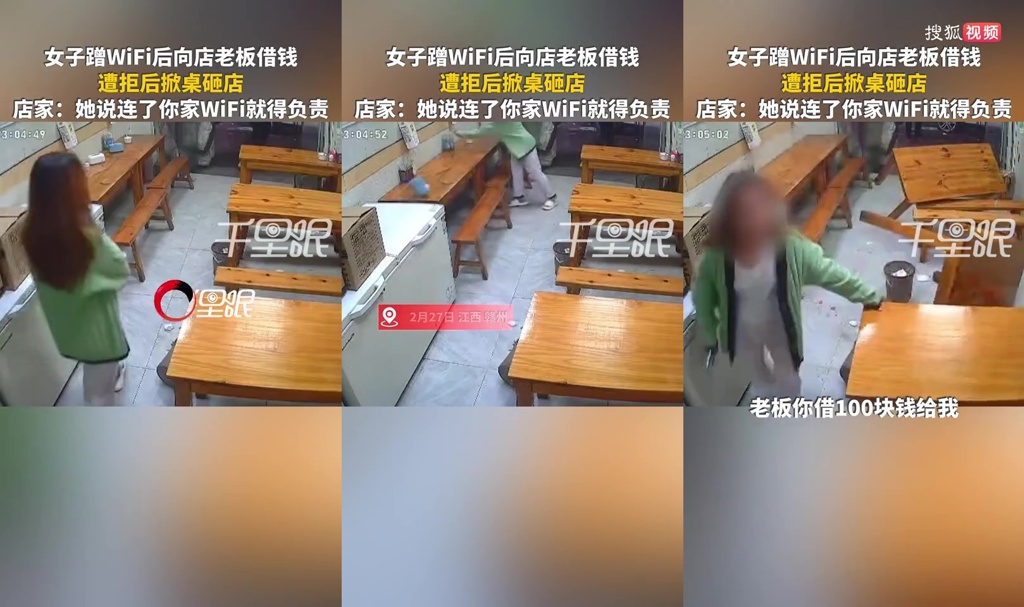 離譜行徑!大陸江西贛州一名女子日前到一家店鋪詢問WiFi密碼,連線成功後在門口滑了會兒手機,沒想到隨後竟進店開口要借100元,還大言不慚地說:「手機裡沒錢了,連了你家WiFi就得對我負責。」店家當場拒絕,這名女