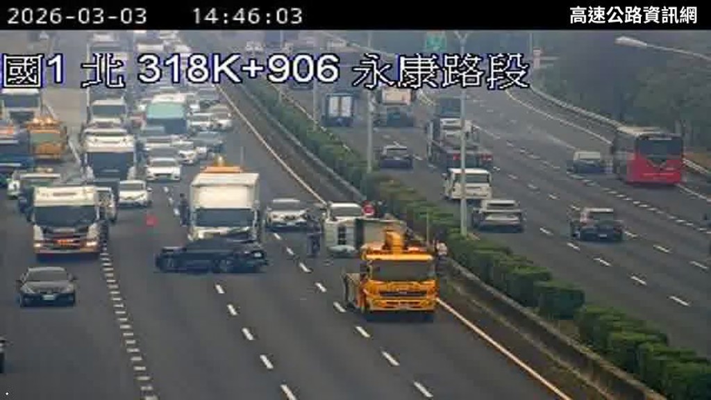 國道1號永康路段今(3)日下午發生重大追撞事故,現場慘不忍睹!北向319公里處約在下午2時43分驚傳連環車禍,總計有3輛自小客車、1輛小貨車及1輛大貨車撞成一團,其中小貨車當場翻覆,車體橫躺在車道上,場面駭人。