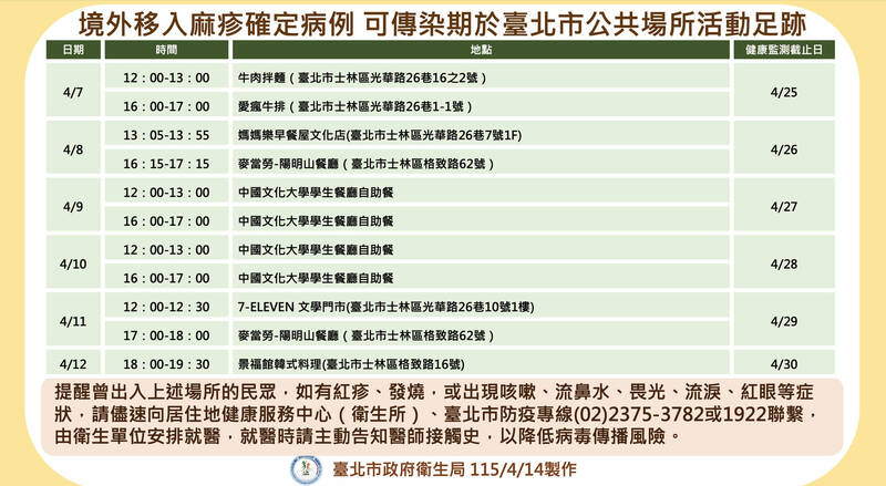 台北市衛生局今天表示,北市新增1例麻疹境外移入確定病例,為外籍大學生,自吉爾吉斯入境。個案頻繁出入文大學餐、麥當勞,針對同住者及相關活動場域,已匡列接觸者共164人。衛生局指出,個案在3月29日入境後於4月7日開始有發燒、喉嚨痛症狀,4月11日從臉、手部到身體出現紅疹,4月12日就醫後經醫師評估懷疑麻疹通報採檢,於4月14日經疾病管制署研判為確定病例,衛生局針對此個案匡列接觸者共164人,包含同住者、同學及就醫接觸者,將持續進行健康監測至4月30日。