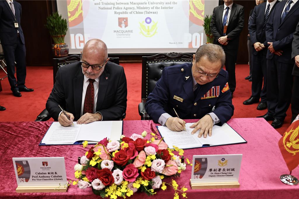 警政署副署長廖訓誠與澳洲麥考瑞大學副校長Anthony Cahalan,2日上午11時為了厚植警政人才國際競爭力並深化刑事司法合作,在警政署共同簽署教育訓練合作備忘錄。現場有澳洲辦事處官員與警務主管觀禮,雙方規劃每年選