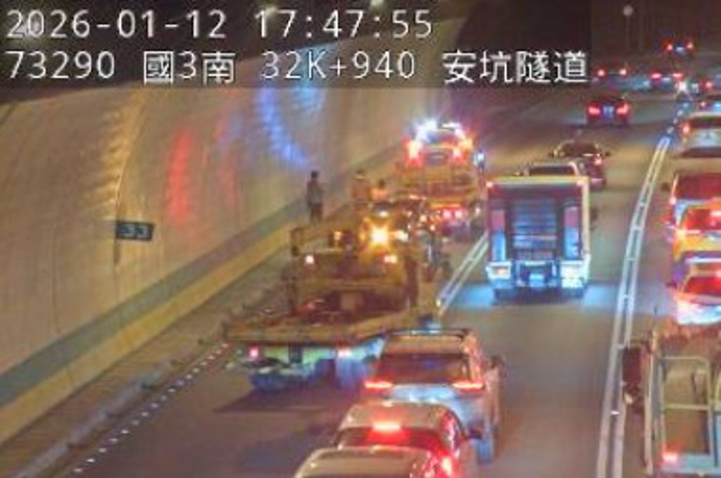 國道3號南向33公里處、新北安坑隧道內,今(12日)下午5時許發生一起追撞事故!據了解,現場為2輛小客車發生碰撞,事故占用內線車道,導致車流回堵,正值上班交通逐漸繁忙時段,嚴重影響南下通行。據了解,事故發生