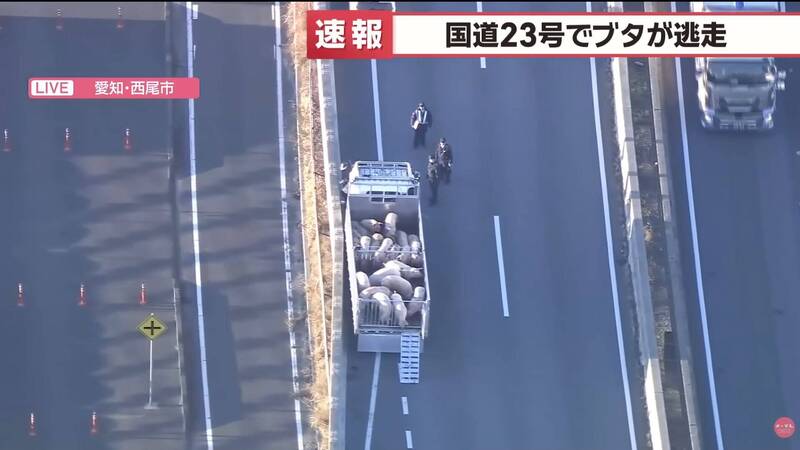 日本愛知縣西尾市的高速公路,今(12)日下午發生一起動物逃脫事故,有10頭以上的豬隻,突然集體跑到國道23號西尾東交流道附近,引發駕駛與民眾恐慌。當地警方接獲多人通報「豬群逃跑」(ブタが逃げている)的消息,已緊急下令封閉部分路段,目前正在全力追捕逃竄豬隻。綜合日媒報導,這起事件發生在日本時間今日下午2半點(台灣時間下午2點半)左右,西尾署警方表示,接獲許多民眾通報「有豬群在高速公路上跑」,還有人指出這些豬隻是從一輛行駛中的卡車上逃脫。趕赴現場的警方,初步清點在國道上四處亂竄的豬隻,至少有10頭以上,不少駕駛努力小心翼翼避開竄逃豬隻,場面相當混亂。