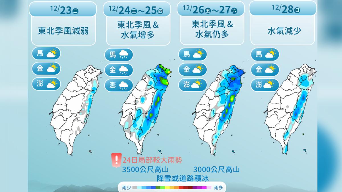 要變天了!明(24)日聖誕夜東北季風增強,下半天起北部及東部將轉多雲時陰陣雨天氣,新竹以南地區雲量開始增多,晚間中南部山區局部會有零星短暫雨發生,週四聖誕節白天期間各地高溫再降,晚間低溫明顯,台北測站預報已達14度,有機會達冷氣團強度,各地夜間低溫約12~15度,週五、週六維持東北季風或大陸冷氣團影響,週四夜間起至週日清晨低溫明顯為本週最低溫時段。