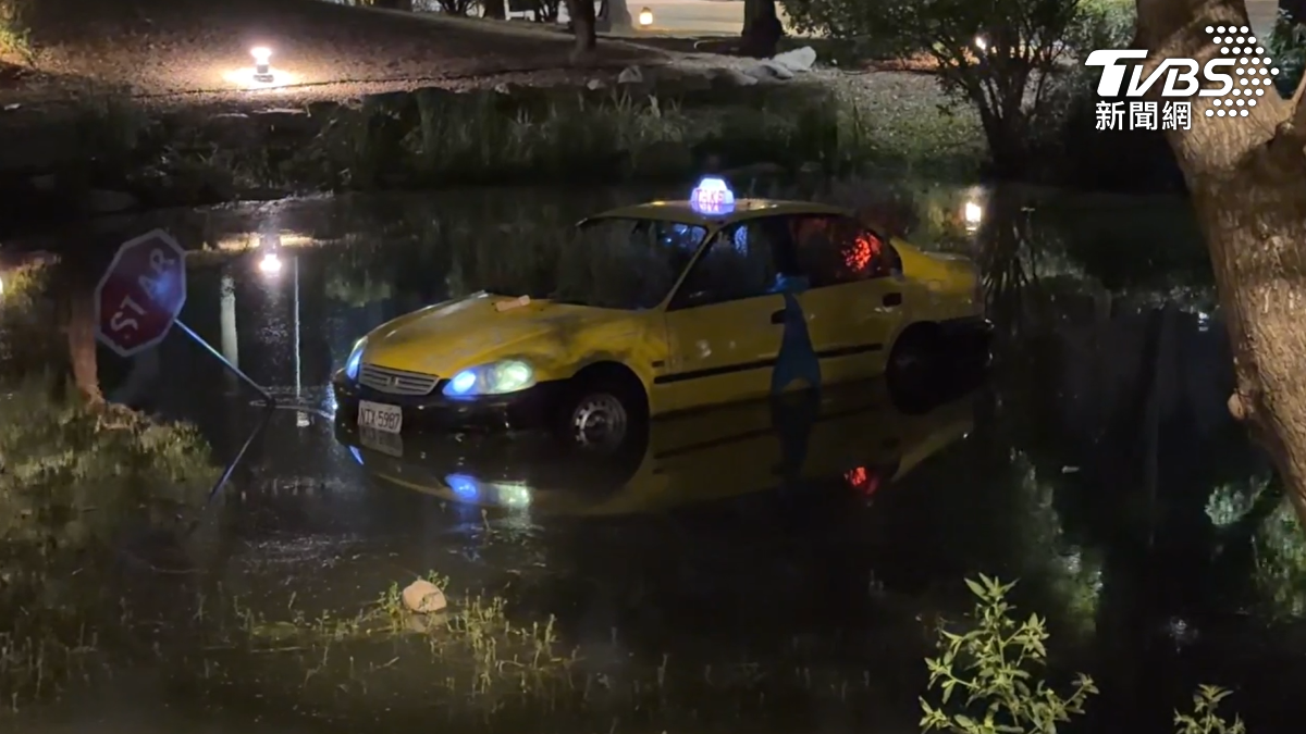 高雄美術館園區水池驚見計程車受困,車內雜草叢生還傳出「死翹翹」聲響,民眾嚇壞報警!警消到場才發現是台電2026高雄公共藝術祭展品,車頂「TAXI」改成「TAKE SEA」、車牌諧音「5987」,逼真程度讓人虛驚一場。