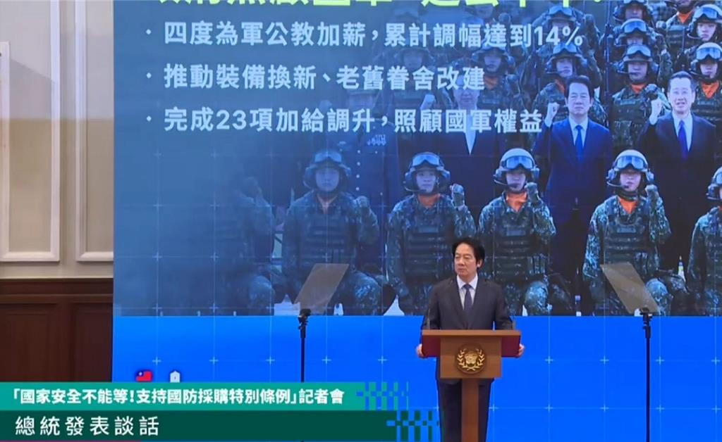 賴清德總統今天上午在總統府召開「國家安全不能等!支持國防採購特別條例」記者會,總統說,近期有輿論指出這筆預算的延宕,與政府沒有編列在野黨委員先前提案替志願役官兵一律每月加薪3萬元有關,並批判政府不照顧軍人,他要嚴正聲明這是完全錯誤的連結。
