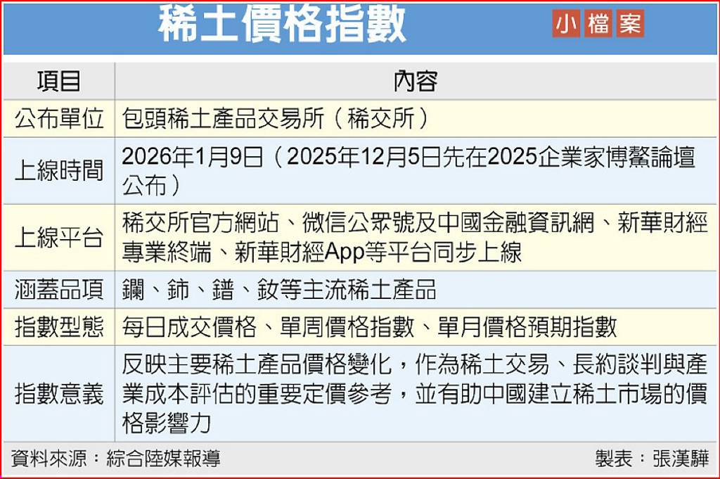 中國正將稀土從「原料優勢」升級為「定價權優勢」。包頭稀土產品交易所(稀交所)9日宣布,稀土價格指數正式在官方網站及新華財經等專業終端同步上線,涵蓋鑭、鈰、鐠、釹等主流稀土產品,業界將其譽為稀土界的「上證指數」。 市場分析指出,這是中國爭奪全球稀土定價權的重要布局。 中國是全球最大的稀土生產國,占全球...