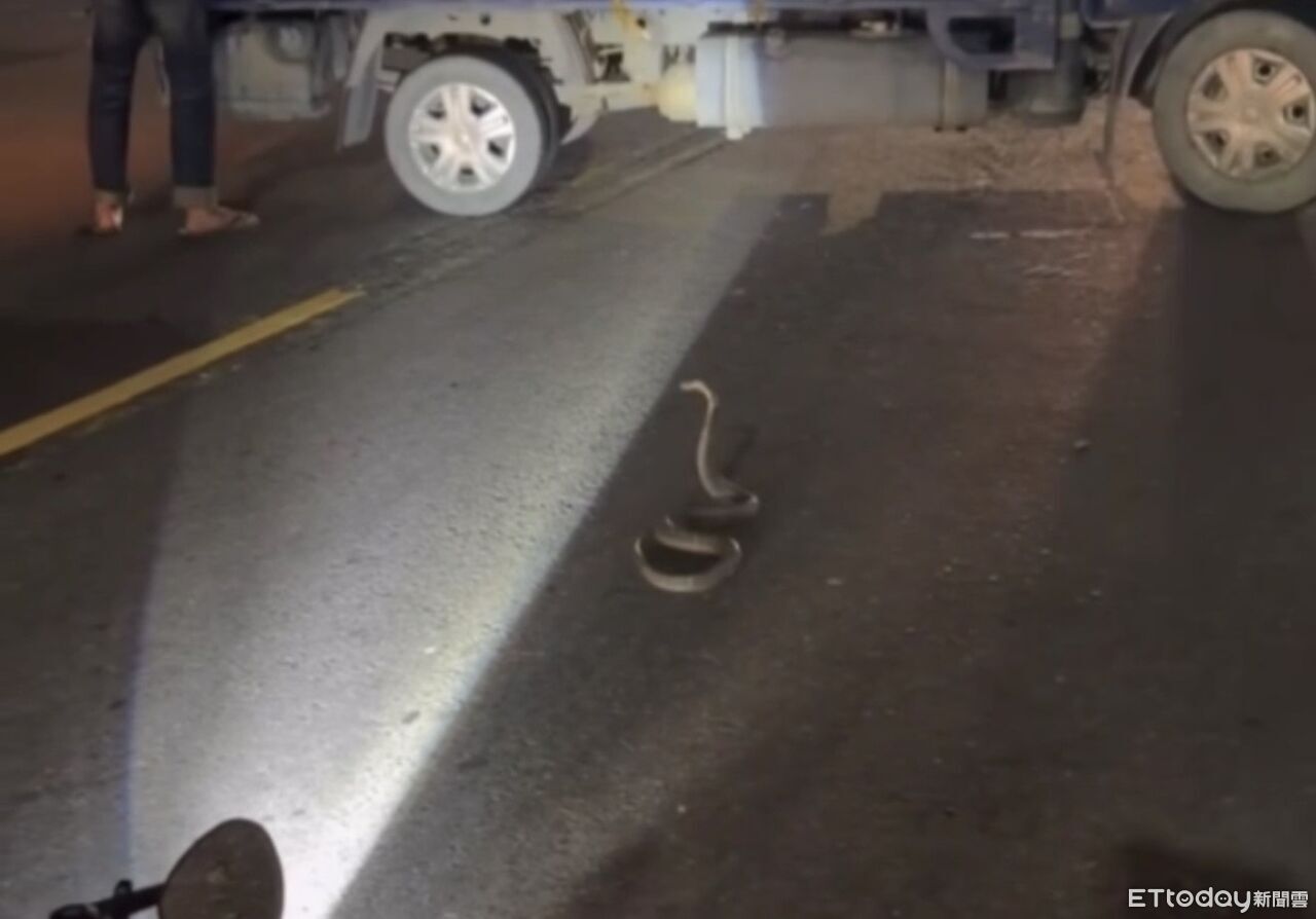 【記者凃建豐/高雄報導】高雄市鳳山區1名重機騎士昨(13)日晚間行駛在鳳山區南華路時,突然前方出現一條長蛇在路上遊走,騎士急忙剎車,後方騎士反應不及追撞,雙雙倒地,所幸僅是腳部擦傷,農業局獲報之後,趕緊派人到現場將蛇捉走。