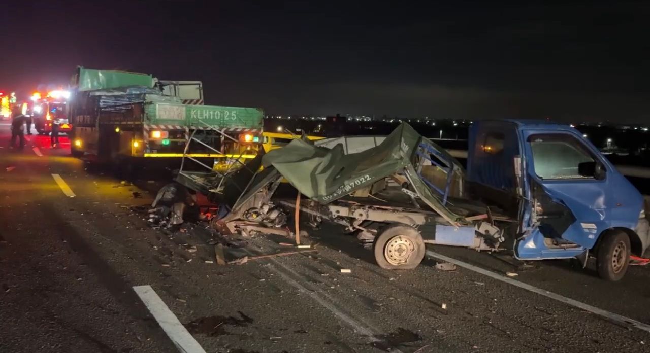 【記者莊曜聰/台南報導】台84線台南麻豆路段今天 (14日)凌晨發生一起嚴重車禍,兩部貨車在東向16.1公里處發生碰撞,兩名駕駛正下車等待處理時,後方駛來的大貨車疑似未注意前方路況猛撞兩車,現場一片狼藉,巨大碰撞造成大貨車司機受傷,其中1名貨車司機被撞進車底痛苦哀嚎,另1人更直接撞飛到橋下,當場沒了生命跡象,警消到場救援將人送醫,重摔至橋下的黃姓司機最後仍回天乏術。