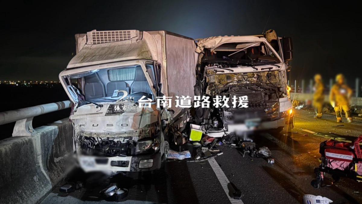 台南市麻豆台84線今(14日)凌晨發生重大車禍,3輛貨車因失控撞成一團,現場零件四散,3名駕駛均受傷,其中一人受困車內,另一名駕駛被從車內甩飛,摔落數十米深橋下,目前2人已送醫,搜救人員仍在搜救失蹤駕駛,事故