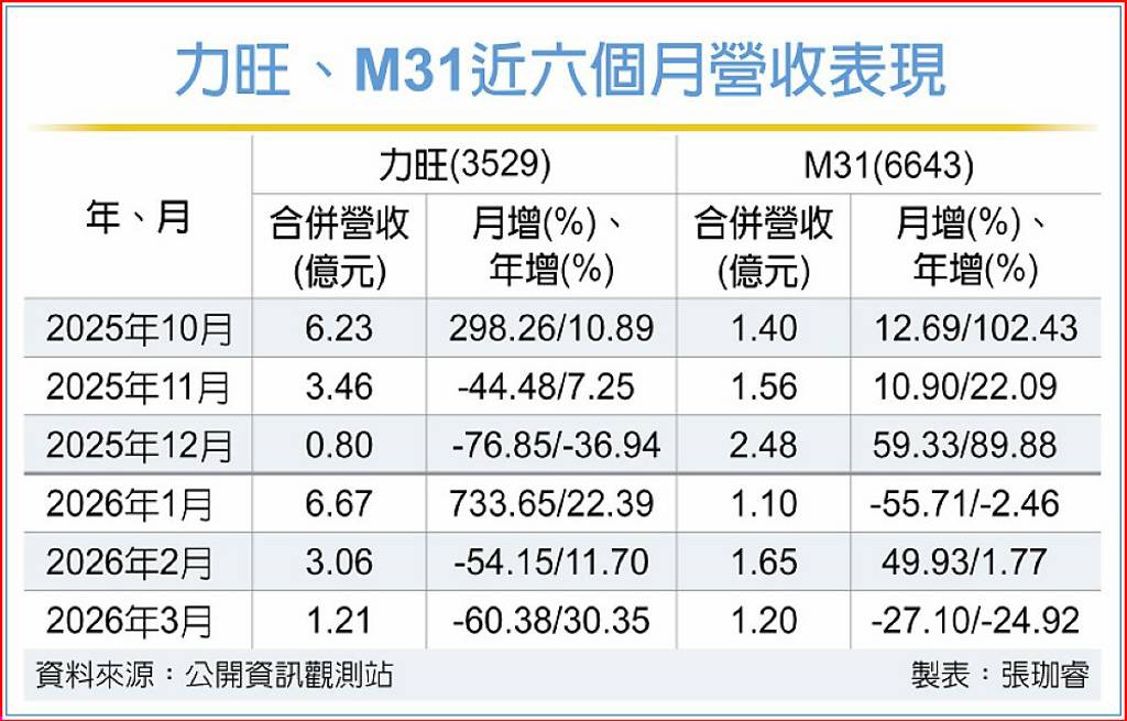 AI算力需求持續爆發,帶動先進製程與高速傳輸規格全面升級,矽智財(IP)產業正式躍升為半導體價值鏈核心環節。力旺首季合併營收再寫歷史新猷,M31則為歷史同期次高;法人指出,力旺與M31受惠AI伺服器、先進製程與車用電子三大趨勢交匯,2026年營運動能同步升溫,後市成長可期。 力旺3月合併營收為1.2...