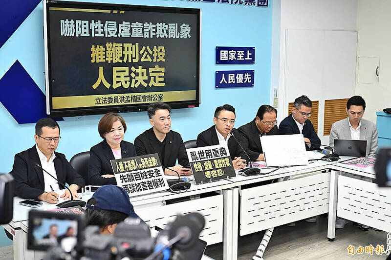 / Staff writer, with CNASeven Chinese Nationalist Party (KMT) lawmakers led by Hung Meng-kai (洪孟楷) yesterday said they are launching a campaign to hold a referendum proposing caning as a punishment for people convicted of “major crimes,” such as large-scale fraud, child abuse and sexual assault.