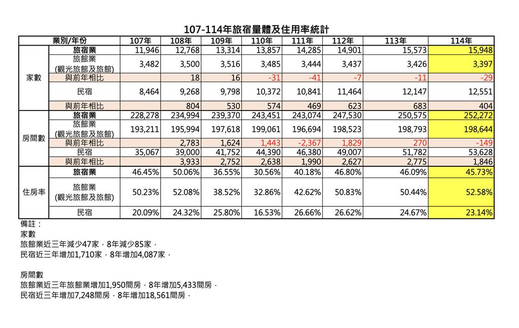 根據交通部觀光署統計,去年旅宿業平均住房率45.73%,整體旅宿業的住客人次達8,209萬人次,較前年的7,879.6萬人次增加約329萬人次,也高於疫情前2019年的7,981.2萬人次;在價格方面,去年旅館業含觀光旅館及一般旅館的平均房價為2,984元,較前微幅增加0.81%。 觀光署表示,隨著...