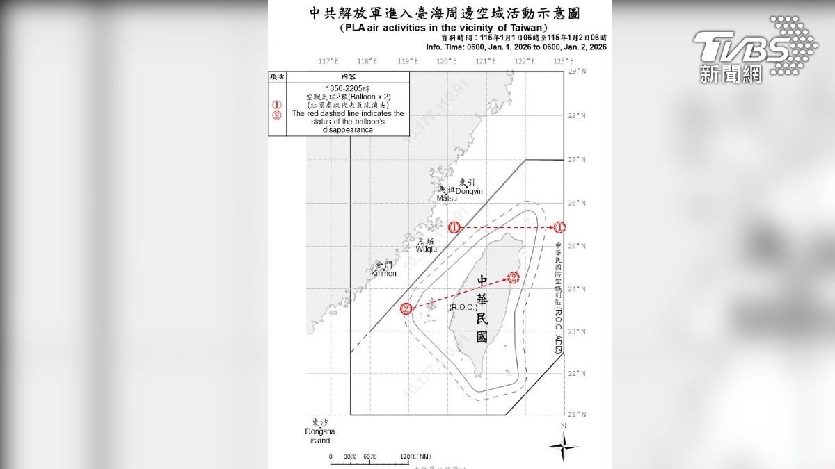 中共2025年12月29日無預警對台發動「正義使命-2025」軍演,30日進一步在台海周邊實施多管火箭實彈射擊襲擾,31日宣布對台針對性演習結束,並稱已完成各項任務。然而,迎接2026年的到來,根據國防部提供最新共軍擾台情況,自1日上午6時至今(2)日上午6時止,24小時內並無共機侵擾,但有施放2顆空飄氣球,其中一顆更從台中西北方飛越台灣上空。