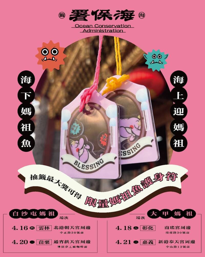 每年農曆三月媽祖誕辰前後,也是白海豚活躍季節,白海豚因而被稱為「媽祖魚」,為強化白海豚保育意識,海保署在白沙屯媽祖進香及大甲媽祖遶境活動期間設攤宣導,贈送限量媽祖魚護身符活動。海保署指出,每年農曆三月媽祖誕辰前後,台灣西岸海象轉趨平穩,苗栗至台南沿近海常可見白海豚出水換氣,漁民相傳白海豚是向媽祖祝壽,所以稱呼牠們「媽祖魚」。