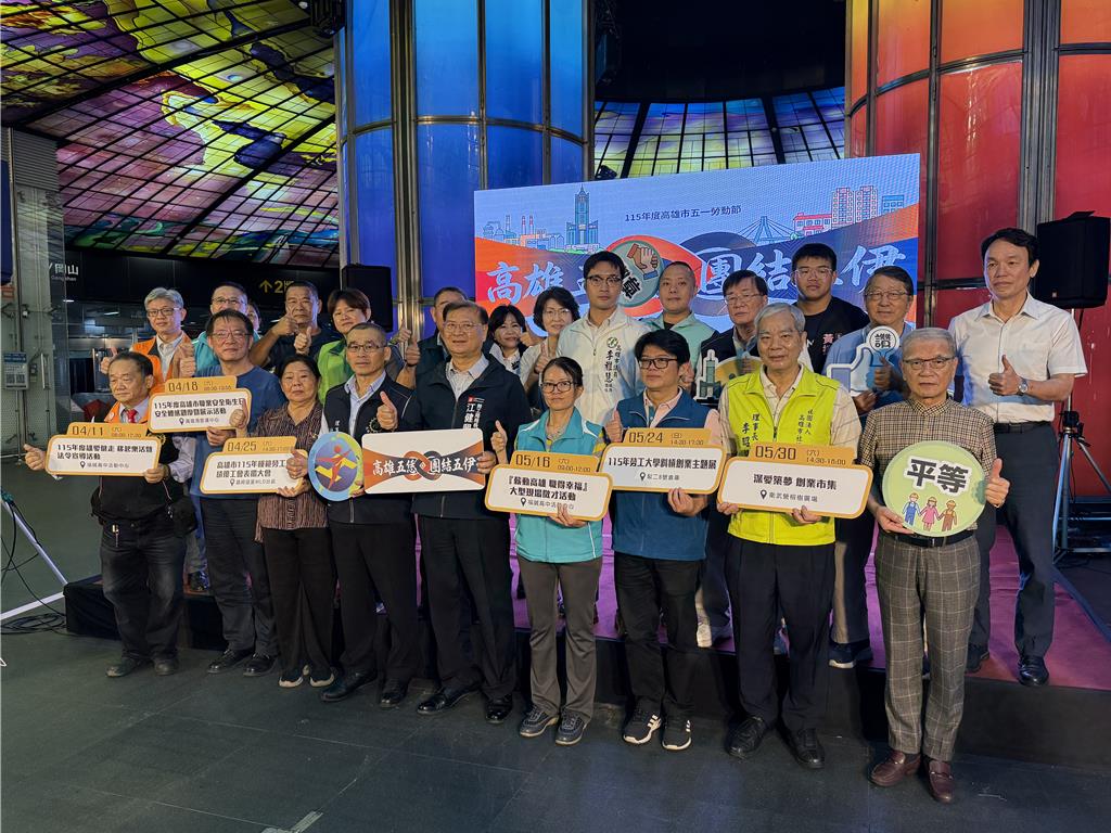 高雄市勞工局10日上午於美麗島捷運站光之穹頂舉辦「115年度五一勞動節系列活動啟動記者會」,為今年五一勞動節系列活動揭開序幕,展現高雄持續團結勞工、促進安全健康與勞動權益、活絡人才培育和就業、力挺弱勢族群、實踐平權城市及社會共好的決心。記者會由勞工局局長江健興及高雄市各工會代表共同啟動及見證下,宣告...