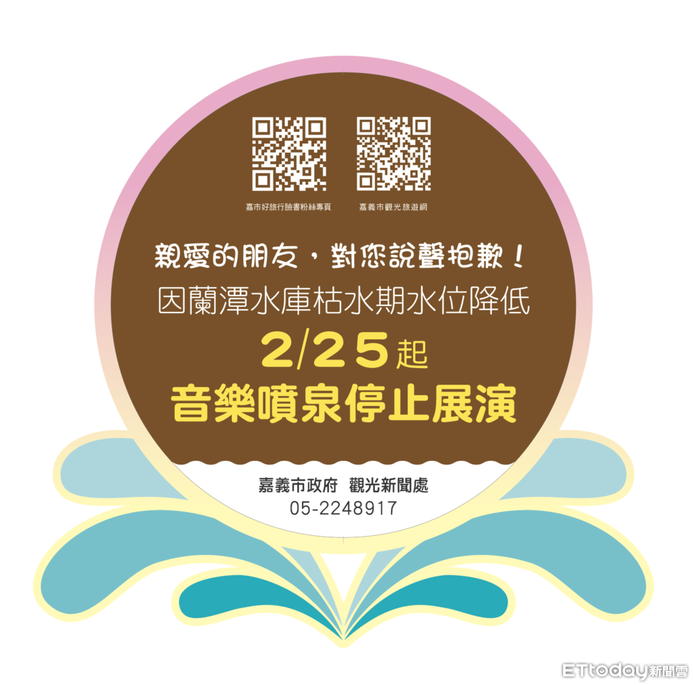 受近期降雨量偏少影響,蘭潭水庫水位持續下降,嘉義市政府考量蘭潭音樂噴泉設備運轉安全,將自2月25日起暫停蘭潭音樂噴泉演出,並視後續水位回升情形,另行公告恢復演出時間。