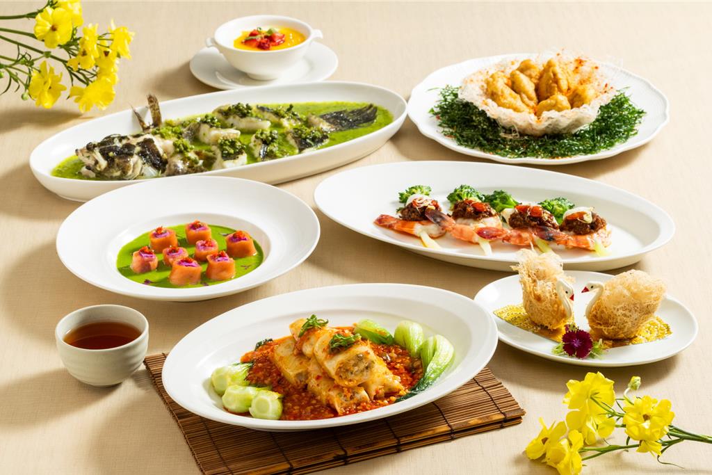 由翠綠與粉嫩交織的「翡翠燻鮭山藥卷」,以燻香藤椒的微麻輕點味蕾,佐翡翠青檸醬的清香微酸,綻放春日清鮮。圖/國賓大飯店提供「魚香釀花膠」以彈嫩頂級花膠釀入鮮甜蝦膠,佐以泡薑、剁椒與藤椒油調製的魚香醬,呈現酸香微麻、層次豐富的春季海味。圖/國賓大飯店提供「鮮花椒筍殼魚」以青醬的草本清麻襯托野山椒與花椒爆...