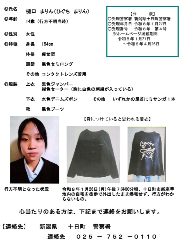 日本新潟縣十日町市15歲(失蹤時14歲)女國中生,1月26日從家裡外出後離奇人間蒸發,4月9日在同縣長岡市信濃川發現一具無名女屍,今(15日)確認就是失蹤的女孩。據《TBS》報導,女國中生1月26日晚間7時30分許還在家中客廳,此後不知所蹤,十日町警察署後續發布少女照片、身高、體型、失蹤當天衣物等特徵,呼籲各界多加注意。