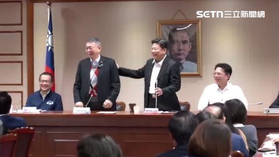 民眾黨前主席柯文哲近期開始頻繁現身公開場合,今(2日)民眾黨團前往拜會國民黨團,一到場先合影後,柯先是笑稱自己「劫後餘生」,而過去曾遭判刑的國民黨立院黨團總召傅崐萁,則笑著安慰柯說「走政治,沒有背個兩三條不會大尾啦!」
