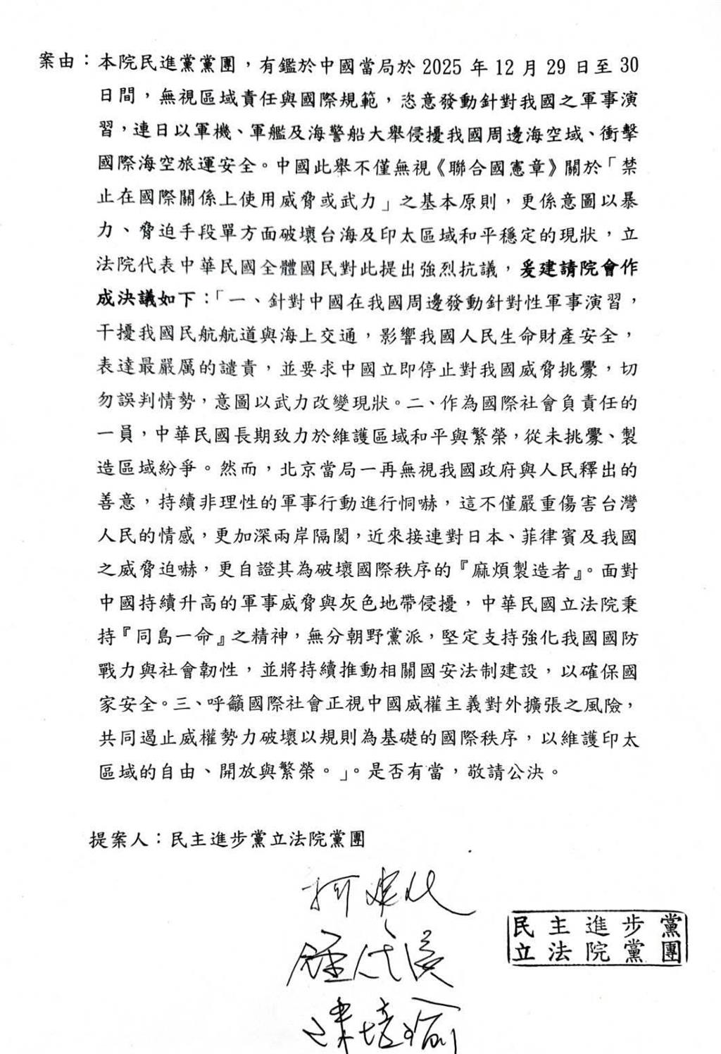 針對共軍上週圍台軍演,民進黨立院黨團在今天院會中,提出譴責中共軍演案,但在藍白聯手下遭否決。民進黨團書記長陳培瑜表示,有這樣的在野黨,對著中共下跪求和,台灣人要更加團結,共同面對境外敵對勢力,才能擁有