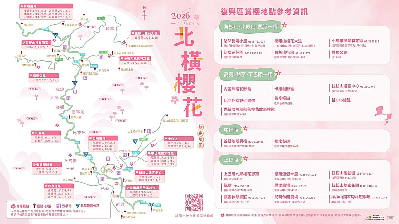 隨著冬季進入尾聲邁入春季,桃園市復興區北橫櫻花季節即將展開,市府觀旅局指出,位於復興區北橫沿線櫻花品種眾多,包括山櫻花、枝垂櫻、八重櫻、香水櫻、昭和櫻、富士櫻及千島櫻等,粉色浪漫從1月下旬至3月下旬皆能觀賞各式櫻花盛開,盛情邀請大眾跟著北橫賞櫻地圖沿著台七線進入桃園復興區,找出您最喜愛的櫻花秘境。