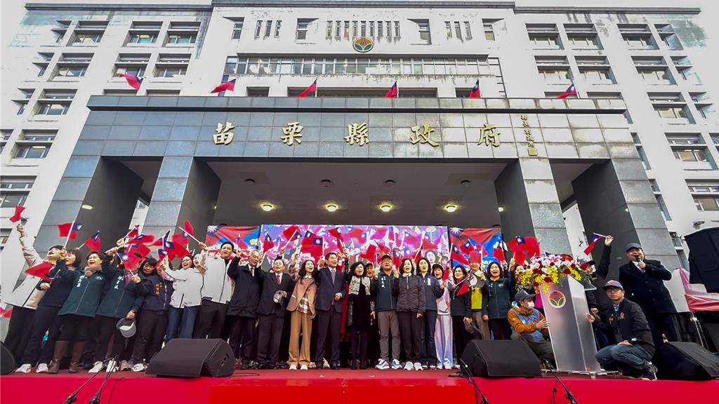 為迎接馬年到來,苗栗縣政府1日在縣府前廣場舉行元旦升旗典禮。縣府近年採「鄉鎮巡迴」方式辦理,去年在苑裡鎮舉辦,今年回到縣府廣場,吸引大批民眾一早到場,共同迎接新年的第一道曙光。縣長鍾東錦表示,馬年象徵