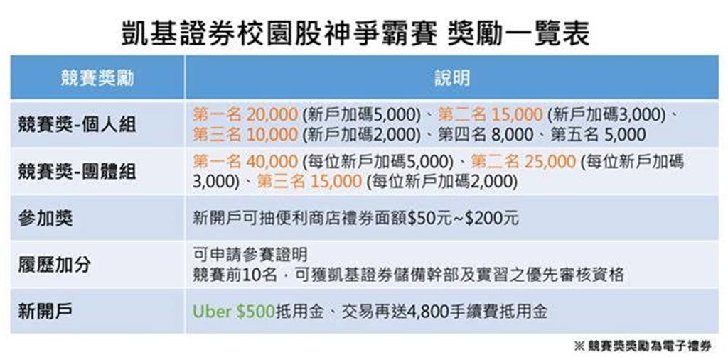 凱基證券積極推廣正確投資觀念,幫助投資新手進入市場,連續第三年舉辦「校園股神爭霸賽」,即日起至4月24日邀請全國大專院校學生報名,競賽分為個人組、團體組,總獎項高達新台幣20萬元。 同時,凱基證券為協助學生以更低門檻啟動投資,活動期間凡透過指定連結新開戶,即可享有「Uber/Uber Eats雙享券...