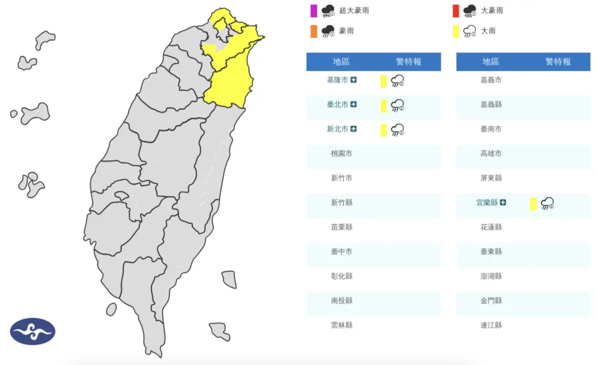 中央氣象署今(1)日發布「大雨特報」表示,受到東北季風影響,今日晚間至明日基隆北海岸、大台北山區及宜蘭地區有局部大雨發生的機率,提醒民眾注意瞬間大雨,山區慎...