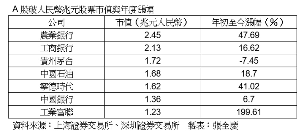 截止自12月31日,A股總市值已超過人民幣(下同)108兆元,創下歷年來的新高。其中,有7檔股票的A股市值超過1兆元,分別為農業銀行、工商銀行、貴州茅台、中國石油、寧德時代、中國銀行、工業富聯。農業銀行今年首次超越工商銀行,拿下A股市值榜首,目前A股市值達到2.45兆元。 在年度漲幅方面,表現最亮眼...