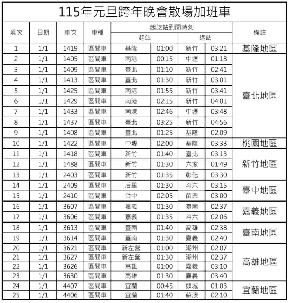 因應跨年晚會活動及元旦假期,台鐵公司規劃加開41列次疏運人潮,包括跨年散場後在北、中、南及宜蘭地區,全面加開區間車共25列次。