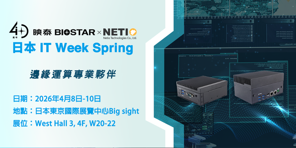 工業電腦設備領導品牌BIOSTAR映泰宣布與台灣IPC解決方案供應商展嘉科技(Netio Technologies)攜手參加2026年日本IT Week春季展,展會於4月8日至4月10日在日本東京Big Sight舉行。參觀者可於 West Hall 3 四樓 W20-22 攤位,親自體驗雙方合作的...